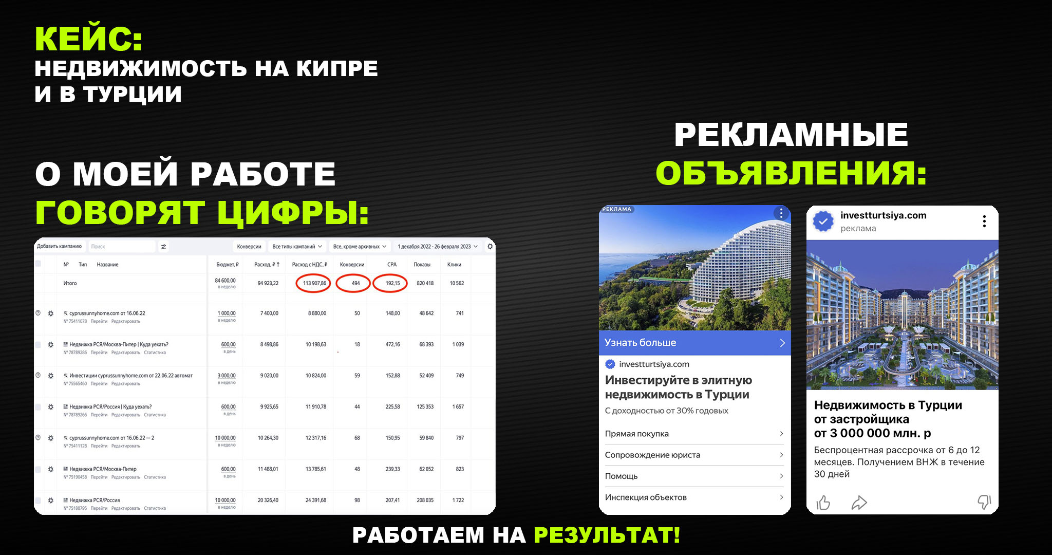 Итоги: За первый месяц реализции рекламной кампании клиент продал виллу на Кипре за 22 000 000 р. при открученном бюджете в 113 000 р. Клиент остался доволен проделанным результатом.