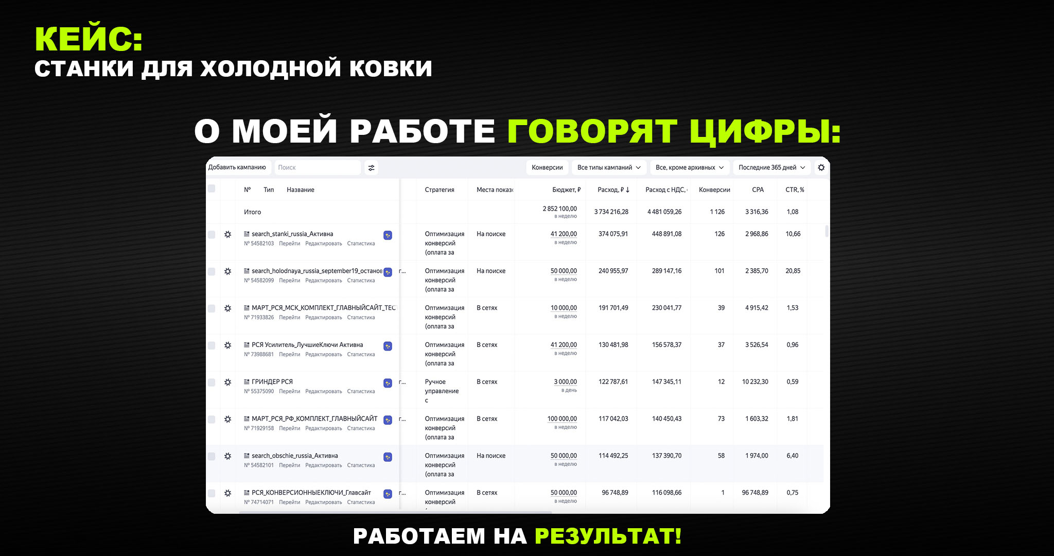 Итоги: Откручено более 4 000 000 рекламного бюджета / Получено 1126 заявок. Клиент остался доволен проделанным результатом.